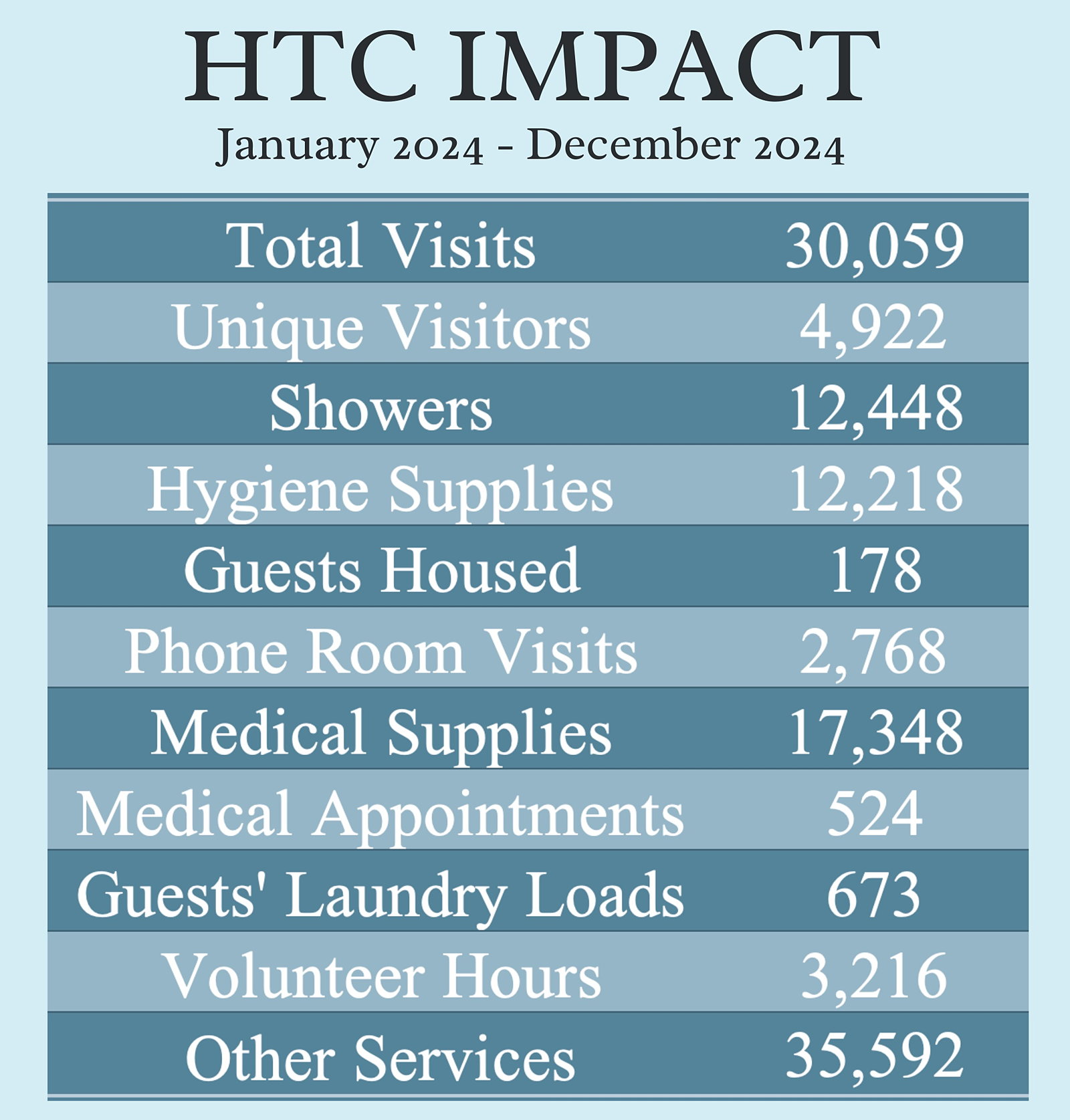 Crucially, we cannot do this work alone. We rely on funding from individual donors to account for more than half of our operating budget, and this year we need more support than ever to fill in the gaps. In 2024, HTC recorded 4,922 unique individuals across 30,000+ visits to the Center, each seeking at least one resource. We are happy to be able to deliver quality care, but we need your help to keep up with capacity and make sure HTC is able to keep up with the evolving needs of our unhoused community.