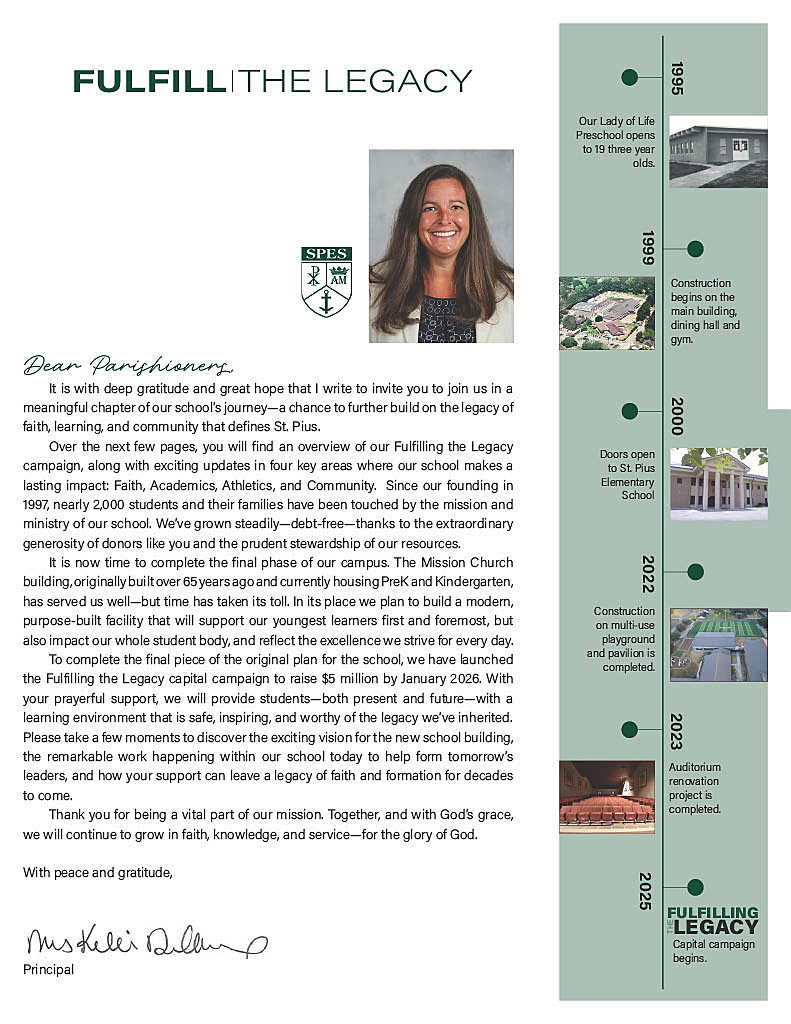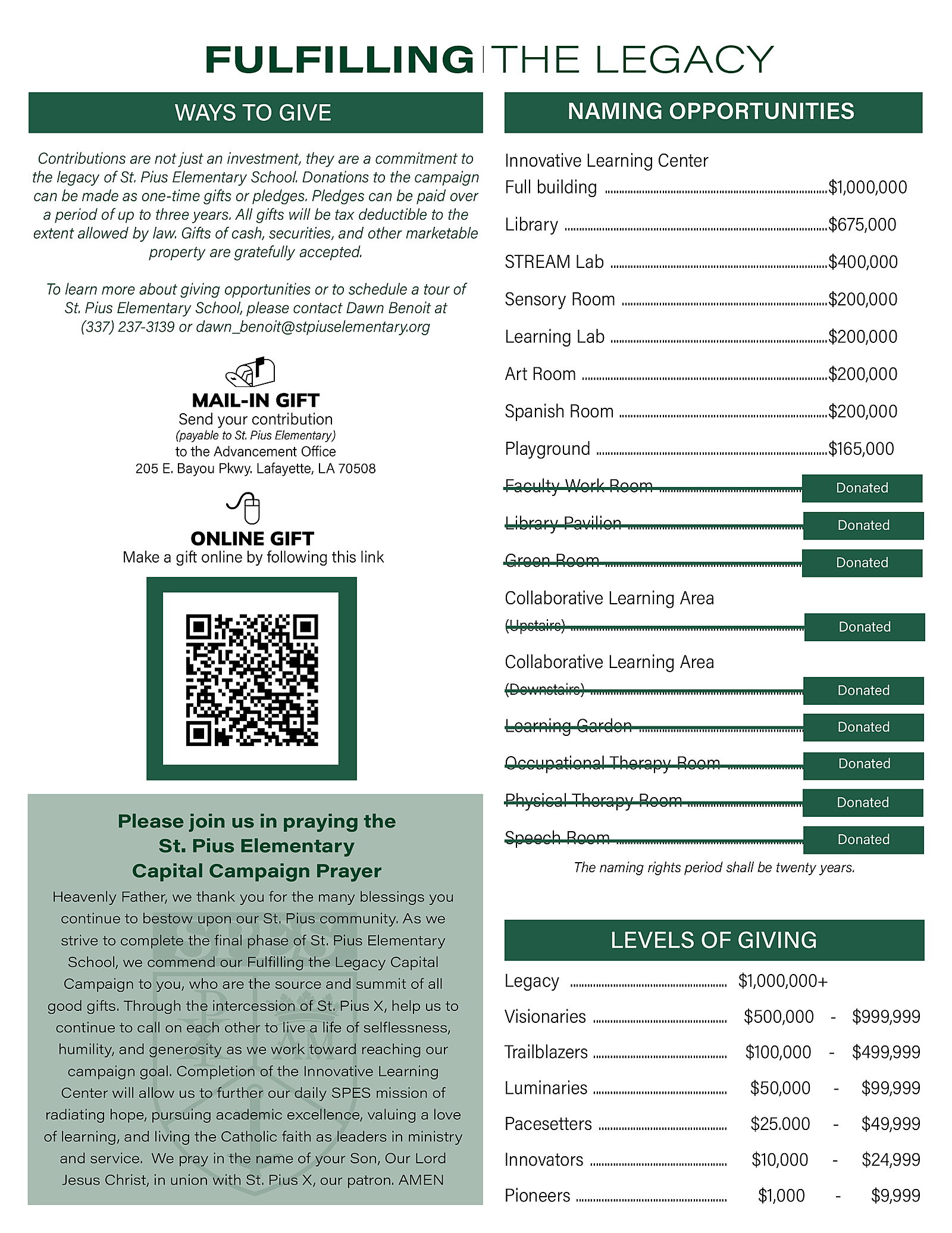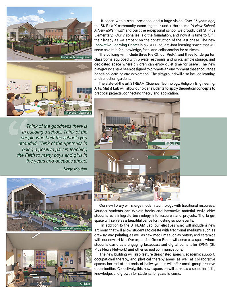 We hope that you will thoughtfully consider joining us in supporting St. Pius X community's largest ministry, St. Pius Elementary School (SPES). All funds will be directed to the construction of the new Innovative Learning Center - 28,000 square feet of learning space that will impact all current and future St. Pius students by serving as a hub of knowledge, faith, collaboration, and growth for PreK through 8th grade. The new building will replace the current PreK and Kindergarten building that is nearing its useful life.