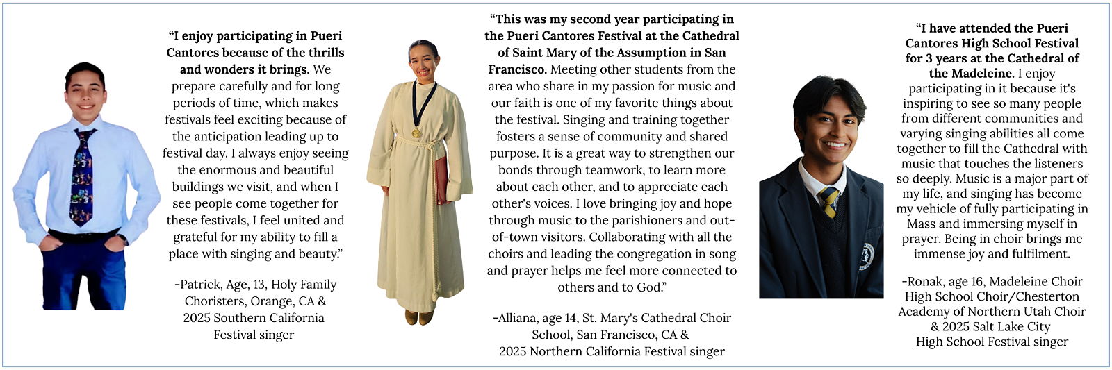 •elevating music education and choral excellence. “I'm learning music that I wouldn't be exposed to any other way. The lessons that I learn from the conductors of the festivals have stayed with me and they continue to help me on a daily basis when I am a cantor or singing in the choir.” Austin, age 17