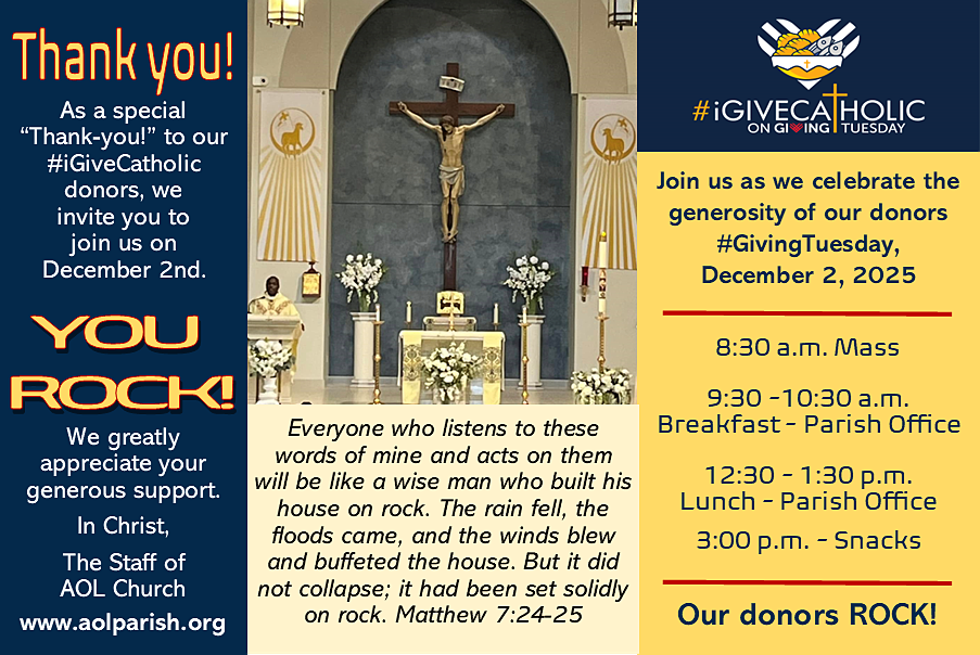 As a special “Thank you!” for our 2025 donors, we are planning a day full of fun, food and fellowship at the parish office on #GivingTuesday, December 2, 2025. Please see details below.