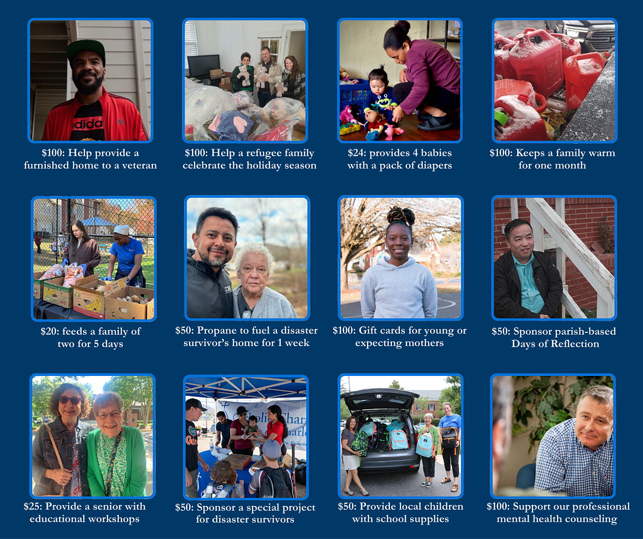 Your gift will provide food, mental health counseling, financial assistance, and so much more to families, children, and individuals in the Diocese of Charlotte.