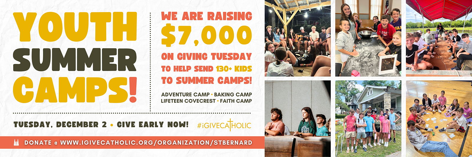 Each year, more than 130 of our St. Bernard youth look forward to attending one of our parish’s summer camps—a formative experience where faith, fun, and friendships come together. These camps are more than just summer activities; they are powerful opportunities for our youth to encounter Christ, build community, and grow in confidence and discipleship.