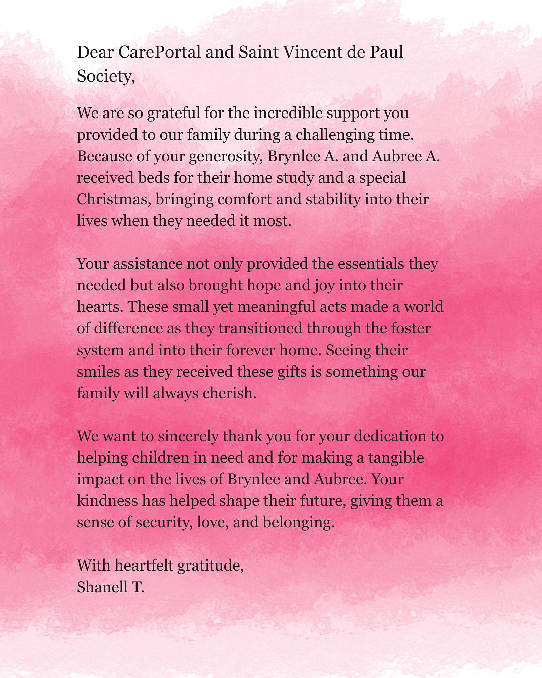 St. Vincent de Paul responds to direct calls for help, meeting individuals personally to assess their needs. CarePortal works through a network where vetted needs are posted and matched with willing responders in our response team.