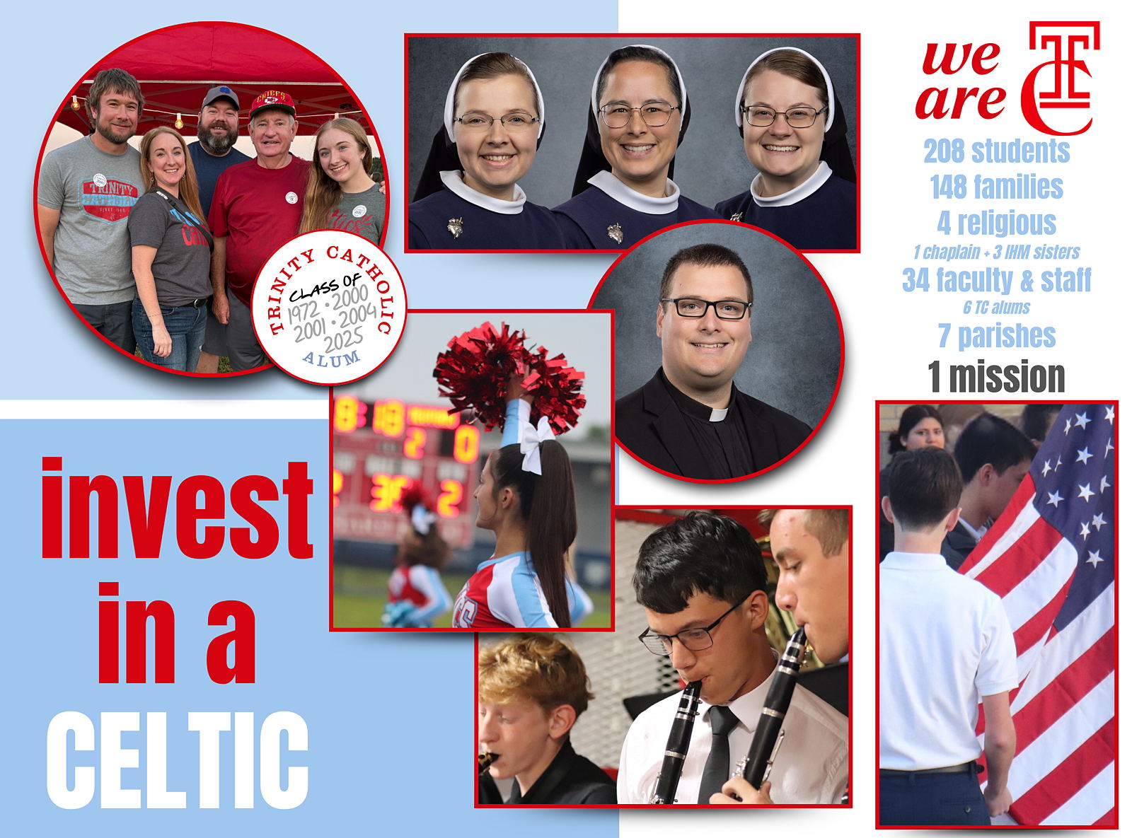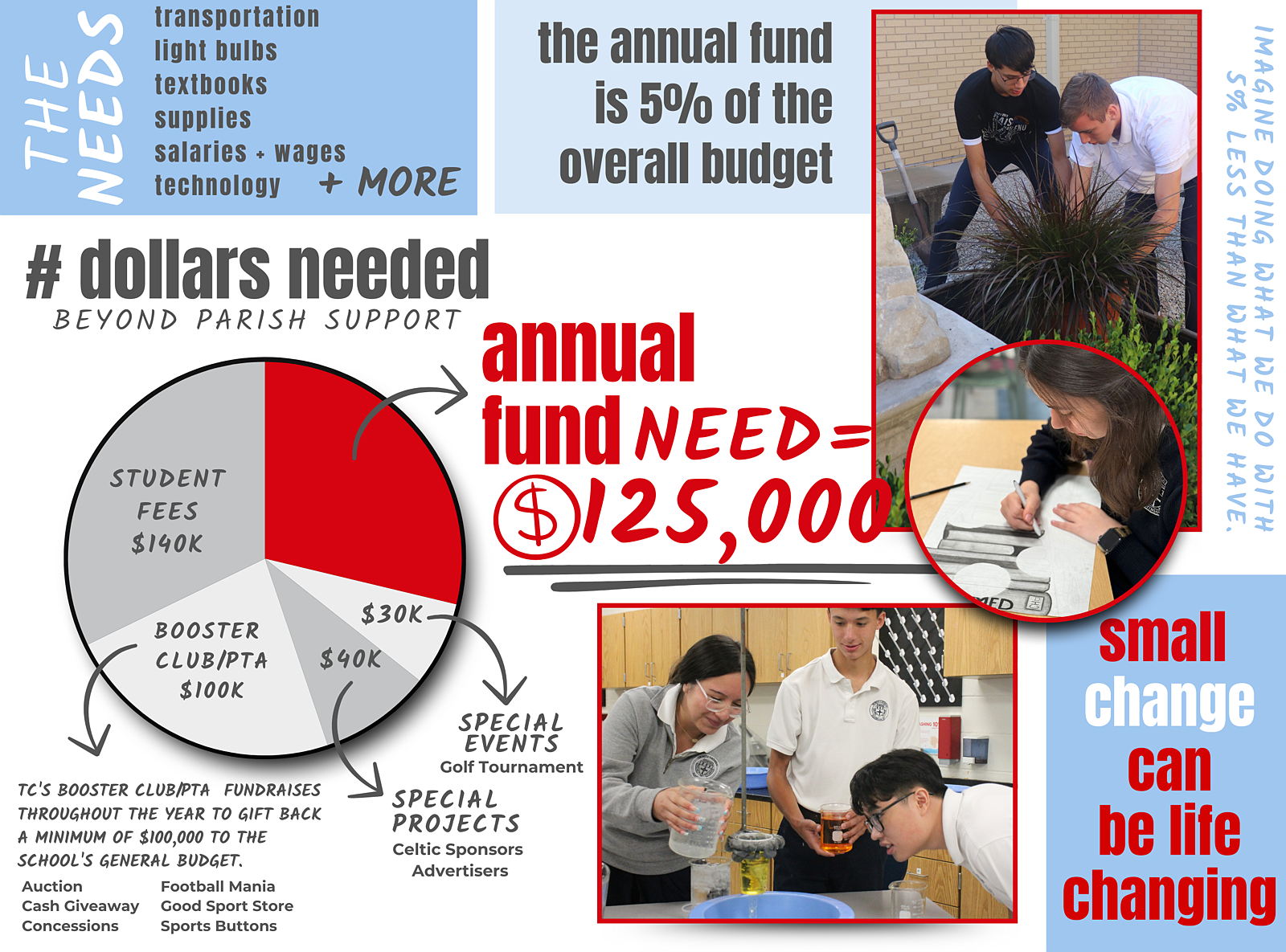 We are incredibly grateful for the generous support we receive from our parishes yet, even with these blessings, plus funds raised through fees, special projects, and the efforts of the Trinity Catholic Booster Club, we still fall short of the need each year. The remainder, the TC Annual Fund, is provided through the generosity of our families, alumni and friends.